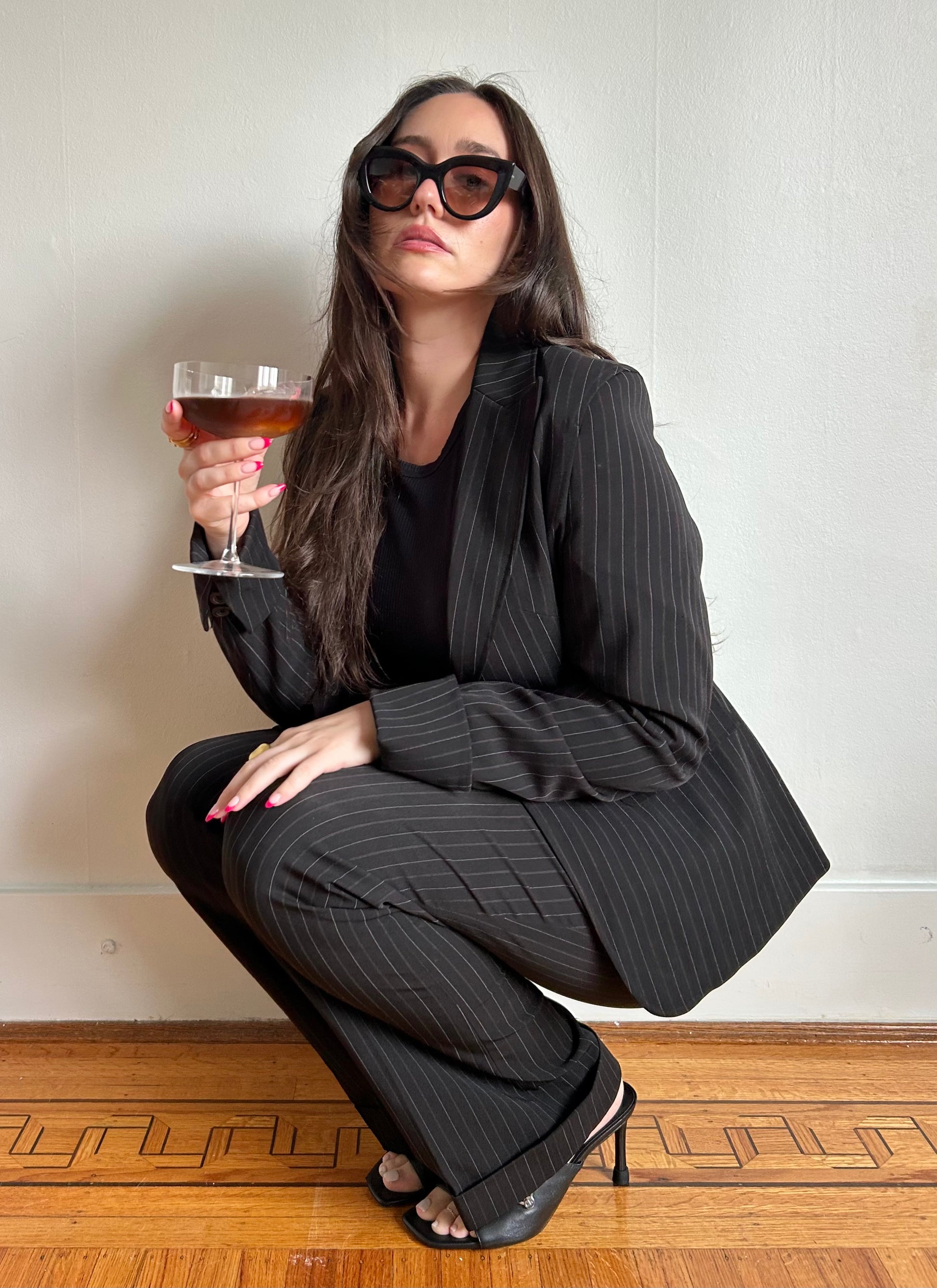 2 piece 90's suit. Long cuffed sleeves on blazer, low rise style trousers